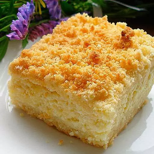 6. Берем форму для выпечки. Насыпаем в нее 2/3 нашего теста. На тесто выкладываем творожную начинку. Сверху присыпаем оставшейся 1/3 теста.