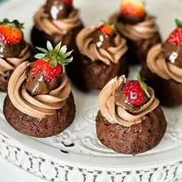 3. Когда наши пирожные-кексы остынут с помощью кондитерского шприца отсаживаем на них крем. Клубнику моем и сушим. Топим снова шоколад, в него макаем клубнику и кладем ее в центр пирожного.