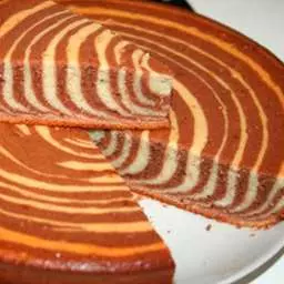 2. Половину теста отложить в другую миску, добавить в него какао и перемешать. Дальше начинаем выкладывать в форму. В центр выливаем 2 столовых ложки светлого теста, затем точно в центр получившейся лужицы 2 ложки темного, затем опять светлого, и так далее.