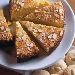 2. Method for the cake: Line the base of a 20 cm round cake tin with parchment paper. Beat eggs and sugar together until light and thick. Sift flour and baking powder together. Fold into egg mixture, alternately with orange juice. Spoon half the mixture into tin.