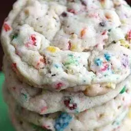 3. Cream together butter and sugars. Add the pudding package and beat until well blended. Add eggs and vanilla extract. Slowly add the flour and mix until just combined. Stir in Fruity Pebbles and white chocolate chips.