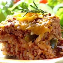 5. Смешать половину сыра, сметану и яйца, залить рисо-мясную смесь.