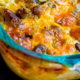 6. Spoon sausage mixture over the eggs and cream in the baking dish and then top with remaining cheese. Cover dish with foil and chill overnight.