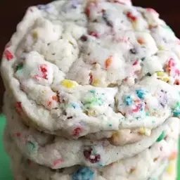 2. Cream together butter and sugars. Add the pudding package and beat until well blended. Add eggs and vanilla extract. Slowly add the flour and mix until just combined. Stir in Fruity Pebbles and white chocolate chips.