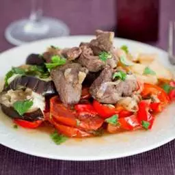 4. После того, как мясо потушится около часа, добавить к нему овощи слоями: сначала картошку, потом лук, перец, баклажан. Солить-перчить . У меня получается целая кастрюлька (на 2.5л), до самого верха. Включаем Тушение на час опять.