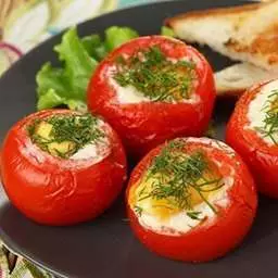 5. Поставьте полые помидоры на противень. В каждый вбейте яйцо. Посолите по вкусу.