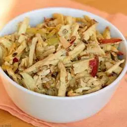 2. Заправка: Смешайте натуральный йогурт с горчицей, солью и перцем, по вкусу можно добавить немного лимонного сока. Заправьте салат с курицей и перемешайте.
