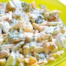 1. Сыр нарезать маленькими кубиками. Добавить нарезанное кубиками или соломкой яблоко. Лук очень мелко нарезать. Добавить к салату. Яйца сварить вкрутую, почистить, нарезать кубиками. Добавить к салату. Добавить мелко нарезанный укроп.