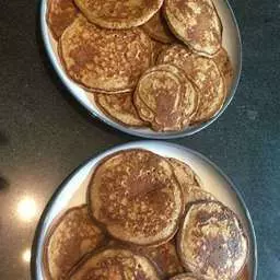 2. Heat pan (with a little coconut oil, when hot pour in batter (1/4 cup per pancake), brown in both sides (2-3 mins).