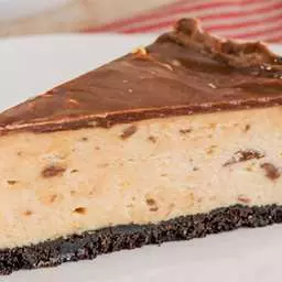6. To make the topping mix the caramel and chocolate together. Spoon the caramel and chocolate mixture onto the cheese cake and sprinkle with the peanut brittle. (The peanut brittle can also be added on just before serving if the cake is going to stand in the fridge till needed.) Remove cheese cake from the cake pan and serve.