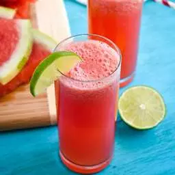 1. Puree the watermelon and water in a blender until smooth. Add sugar to taste. Cut the lime slices in half. Place a half lime slice into each of 8 glasses along with 3 mint leaves.
