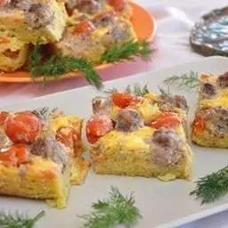 3. Массу выкладываем в смазанную растительным маслом форму и разравниваем. По поверхности, слегка вдавливая, равномерно выкладываем мясные шарики и помидоры черри.