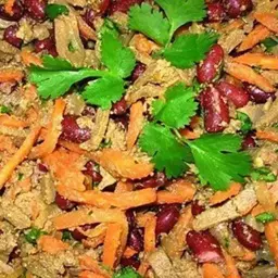 2. Печень отварить и порезать тонкой соломкой. Смешать морковь, печень,лук и добавить фасоль.