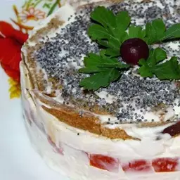 2. Все слои смазываем майонезом. Верхушку салата густо посыпаем маком.