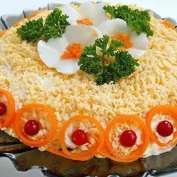 4. Можно украсить салат кольцами из моркови, зеленью или посыпать сверху тертым сыром. Ставим в холодильник на полчаса, после чего подаем к столу.