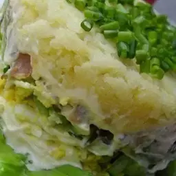 6. Далі решта інгредієнтів у будь-якому порядку: огірки, бекон з цибулею, яйця, змащуючи кожен шар майонезом (або через один). Перевернути форму на блюдо сервіровки вгору дном (трохи постукати по дну, щоб весь салат випав), салат опиниться на тарілці шарами в зворотному порядку, зверху посипати дрібно рубаною зеленою цибулею.