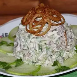 5. Залишилося заправити сузьмою, викласти гіркою та прикрасити цибульними кільцями.