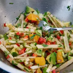8. Pour dressing over Jicama mixture, toss lightly to evenly coat the salad.