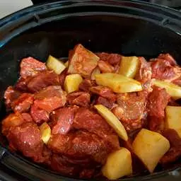 1. Put seasonings, then potatoes and beef on top. Beef stew packet mixed it with 1⅓ water. Threw that in.
