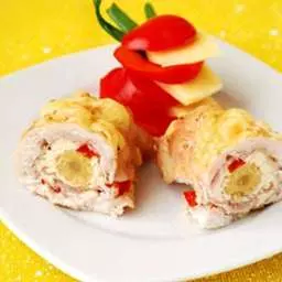 3. На отбитое филе выложить полоску бекона‚ посыпать тертым сыром и красным перцем‚ черным перцем (по вкусу). На краешек положить кукурузный початок. Свернуть рулетик и закрепить зубочисткой.