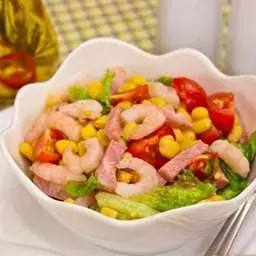 2. Добавить креветки, ветчину, кукурузу (воду слить), помидоры, немножко посолить.